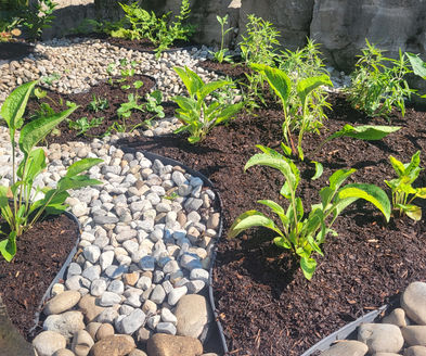 River rock streams guiding water into a lower tier rain garden filled with native perennials.